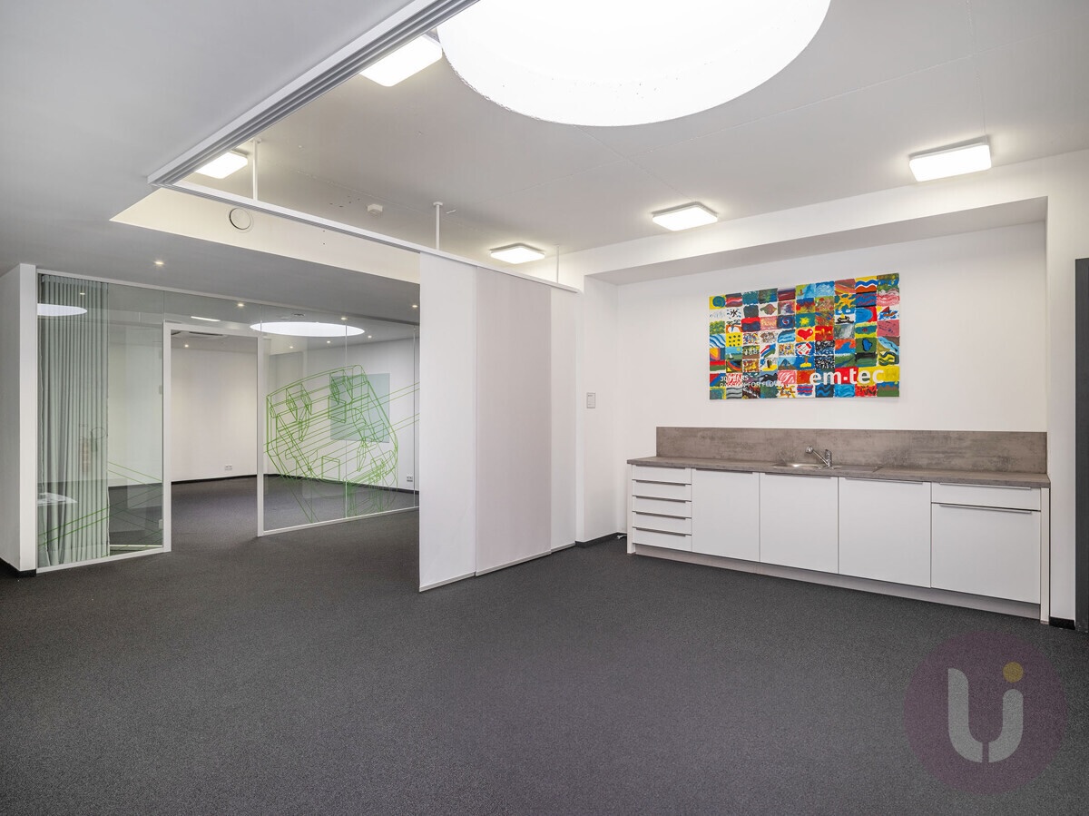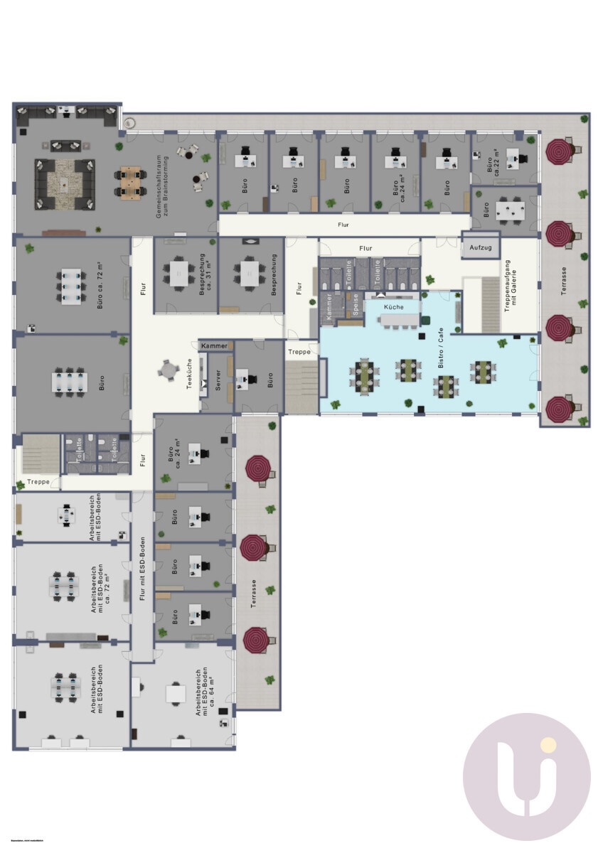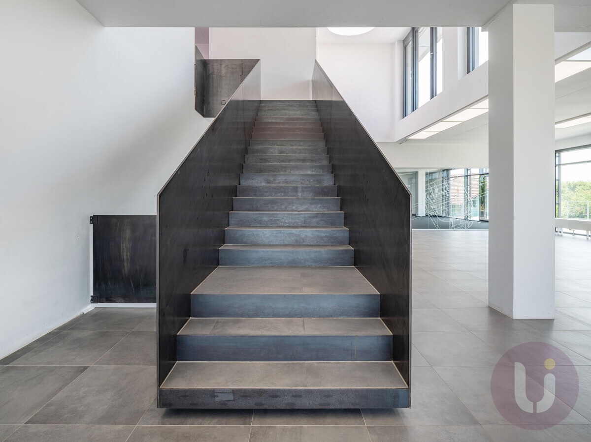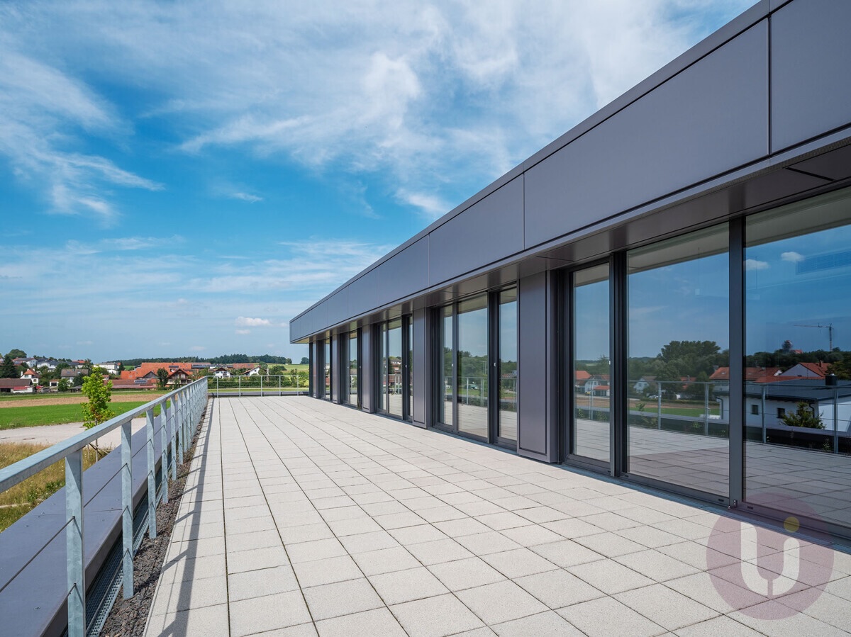 Obergeschoss: Modern gestaltete Büro- und Besprechungsräume schaffen ein produktives Arbeitsumfeld. Besonderes Highlight ist der Café- und Bistrobereich mit attraktiver Dachterrasse – ideal für Mitarbeiterpausen und Kundengespräche in angenehmer Atmosphäre.