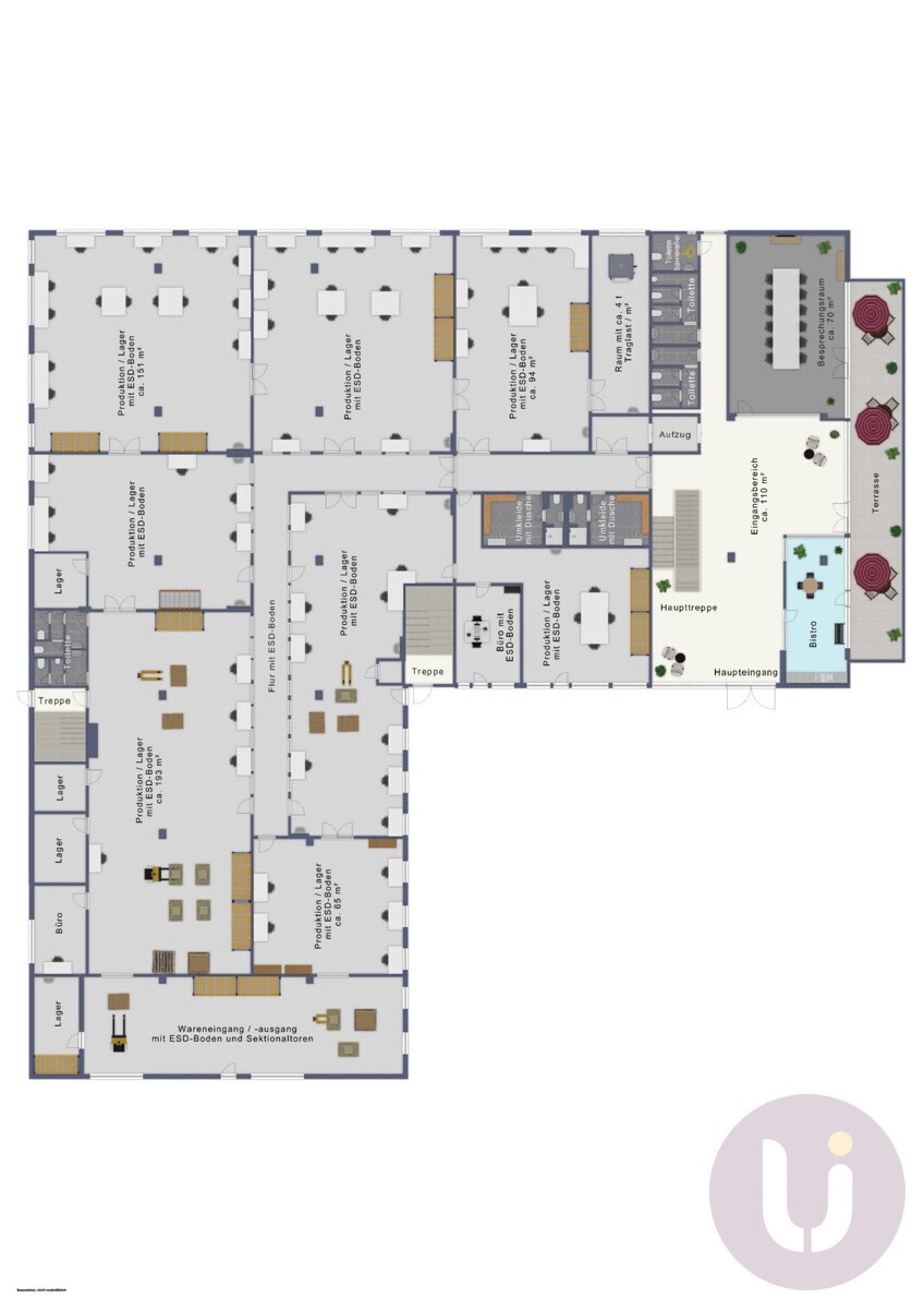 Erdgeschoss: Hier empfangen Sie Ihre Kunden in einem repräsentativen Empfangsbereich. Die gesamte Produktionsfläche mit Warenein- und -ausgang befindet sich auf einer Ebene und ermöglicht optimale Arbeitsabläufe. Ein großer Besprechungsraum sowie ein weitläufiger Ausstellungsbereich für Ihre Produkte runden das Angebot ab.