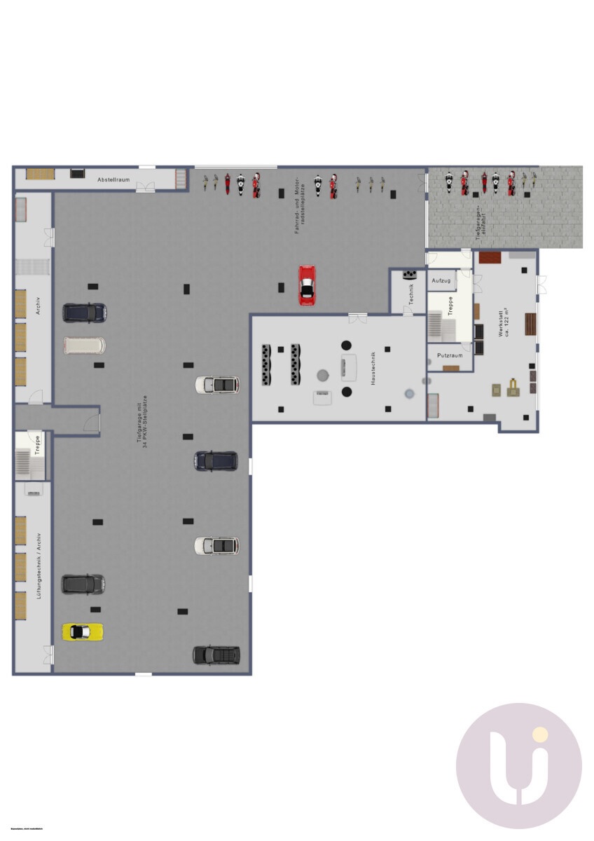 Untergeschoss: Eine großzügige Tiefgarage, Lager- und Technikräume sowie die Möglichkeit für zusätzlichen Warenein- und -ausgang bieten maximale Flexibilität für Ihre Betriebsabläufe.