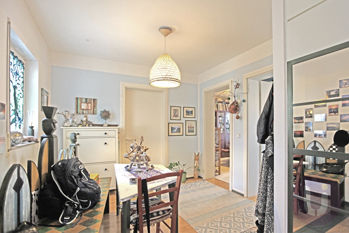 Bereits der Eingangsbereich, vor der Wohnungstüre, empfängt den Besucher mit einem großzügigen Vorraum – ideal als Garderobe – und leitet über diesen breiten, fensterhellen Durchgangsbereich ins Innere der Wohnung. Dieser Bereich in der Wohnung lässt sich hervorragend als Büro, Arbeitsplatz oder Sitzecke nutzen.