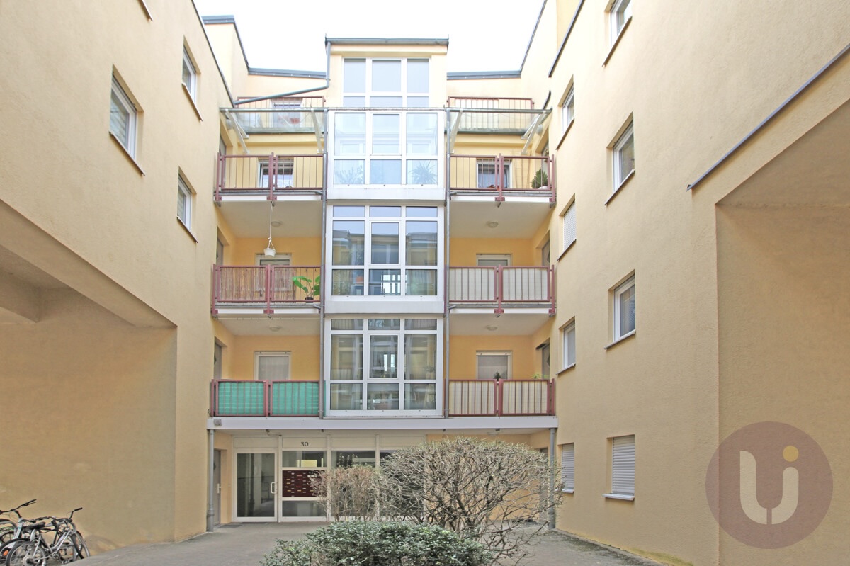• Begrünter Innenhof mit Sitzplätzen und Laubengang