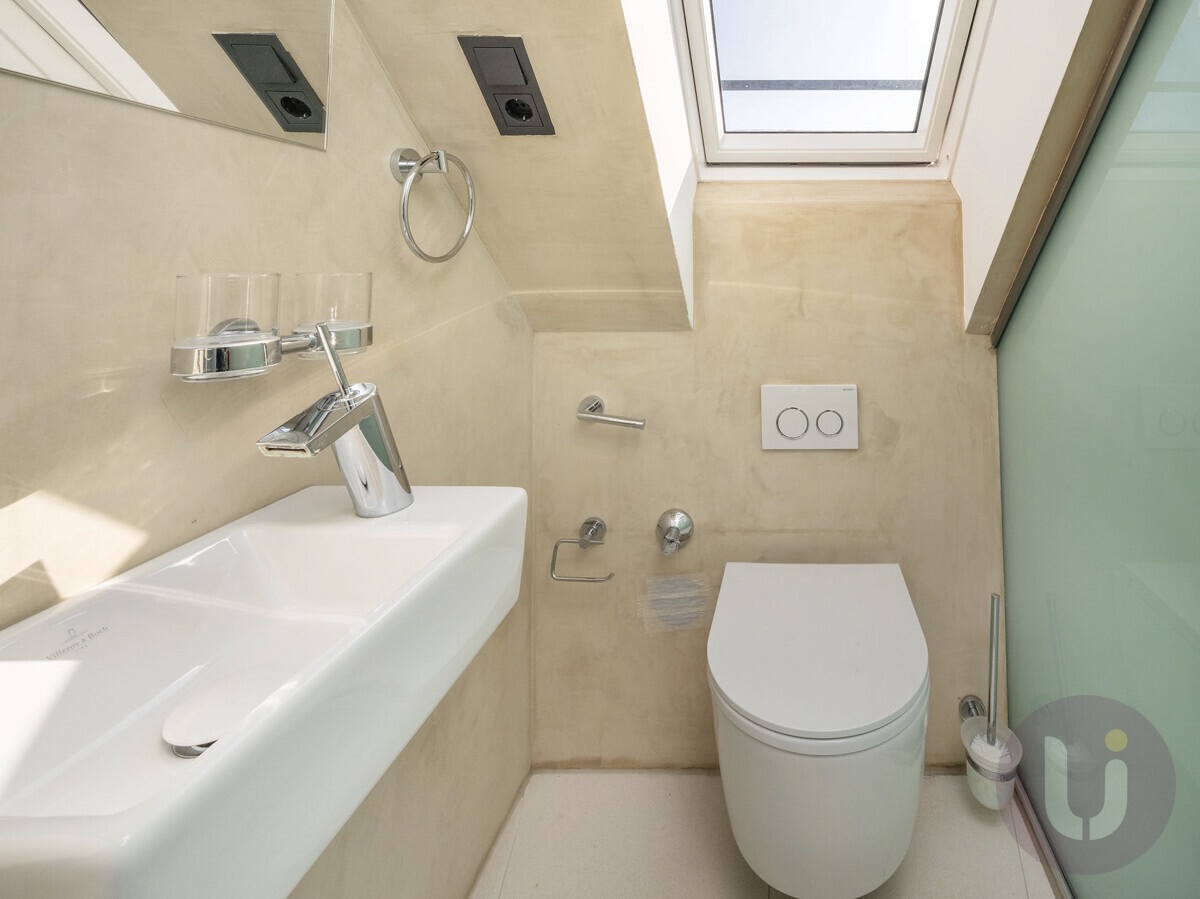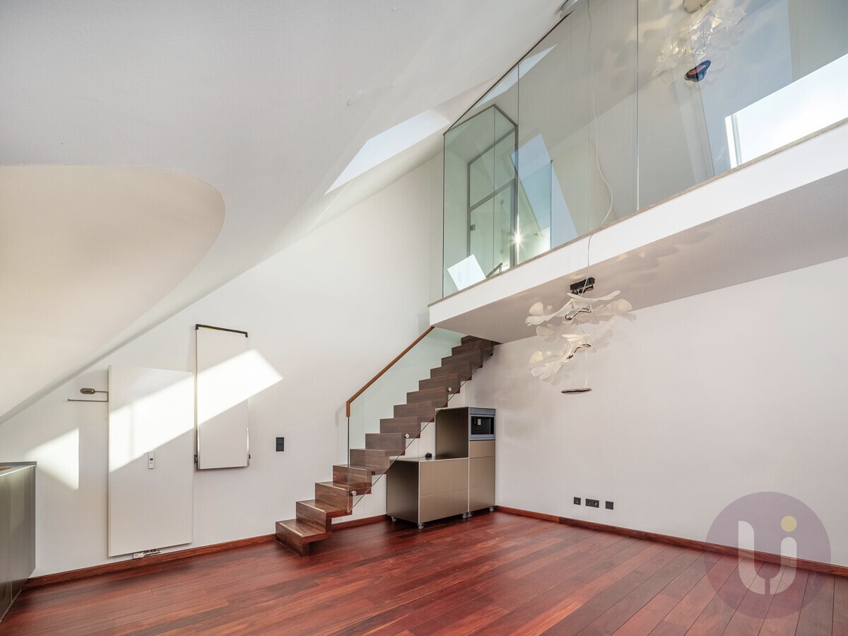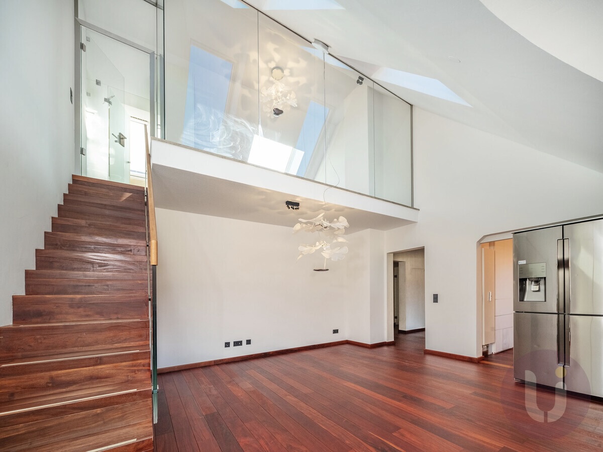 Eine elegante Holztreppe führt zur Galerieebene mit stilvoller Glasabtrennung – ideal als Schlaf- oder Arbeitsbereich mit eigenem Badezimmer.