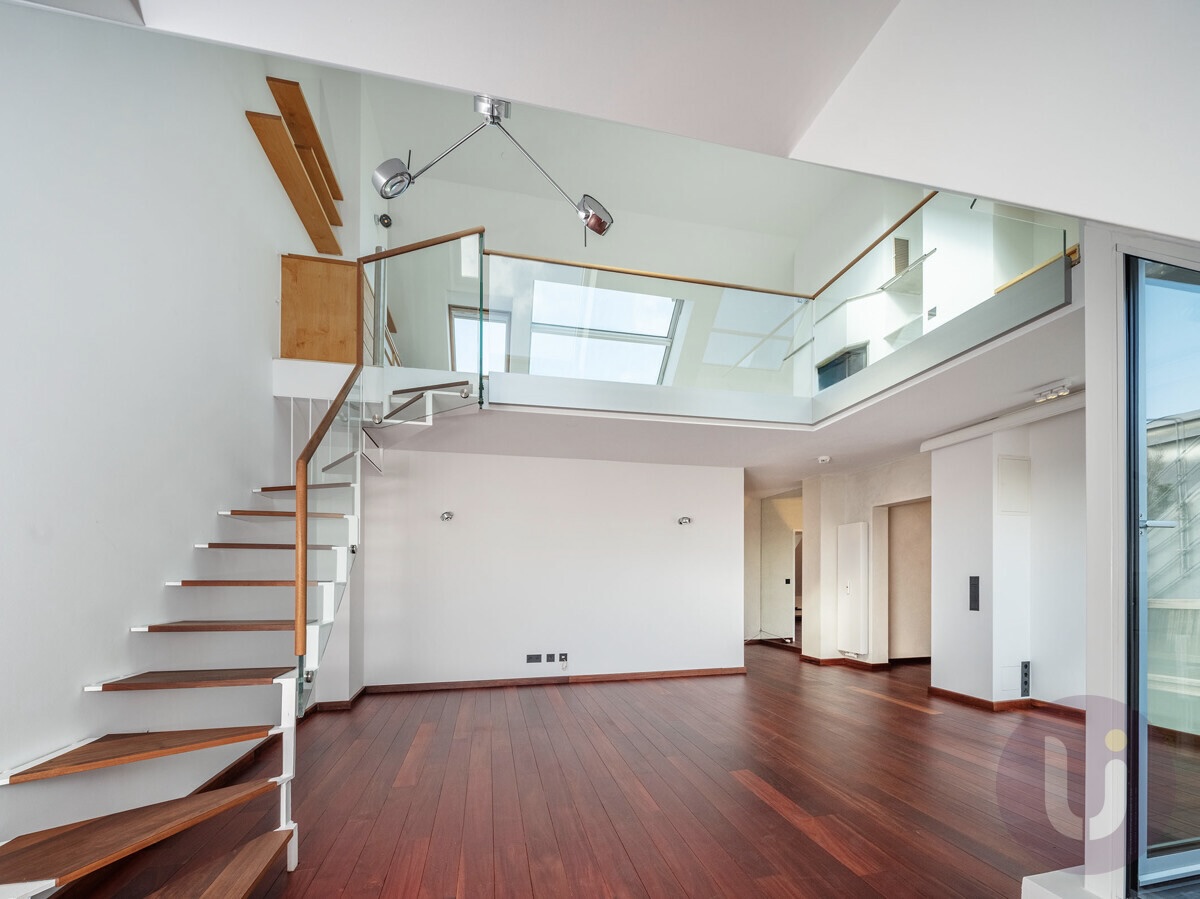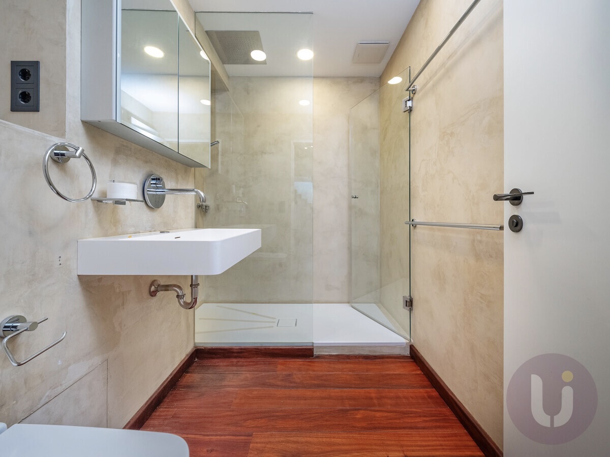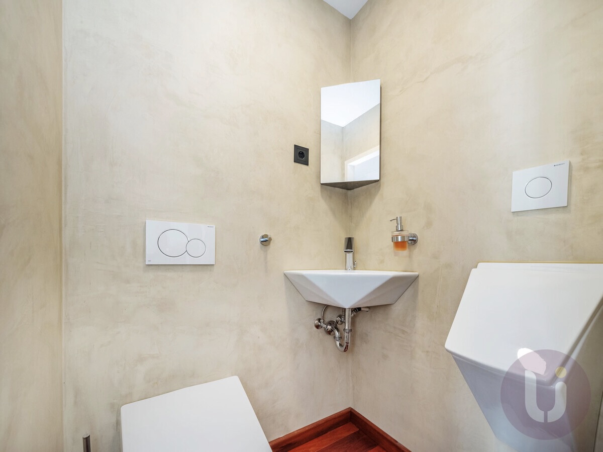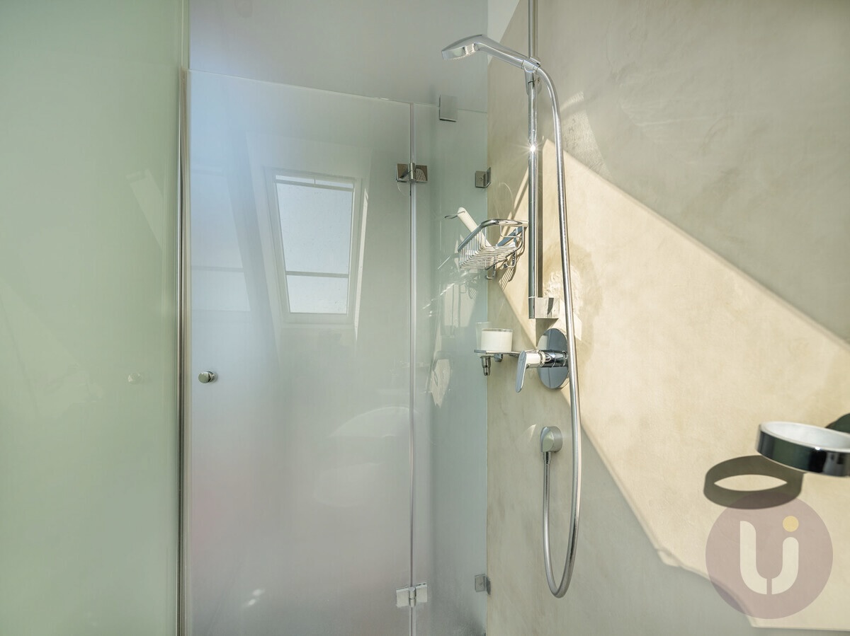 Eine elegante Holztreppe führt zur Galerieebene mit stilvoller Glasabtrennung – ideal als Schlaf- oder Arbeitsbereich mit eigenem Badezimmer.