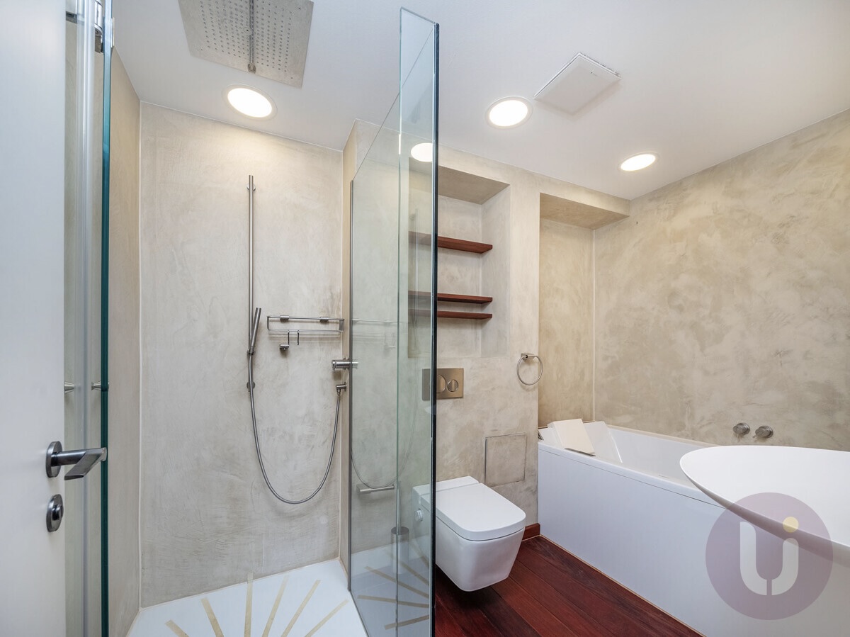 Der linke Wohnbereich begeistert mit einem lichtdurchfluteten, quadratischen Raum und Zugang zur geschützten Innenterrasse – eine Oase der Ruhe. Das zweite Schlafzimmer mit maßgefertigten Schrankeinbauten und luxuriösem Bad en Suite lädt zu entspannten Momenten in der Badewanne ein.