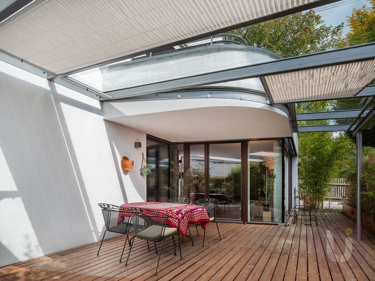 – Großzügige Terrasse mit Holzbelag und Glasdach mit Verschattung