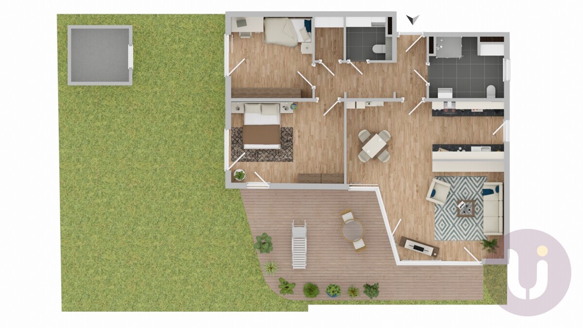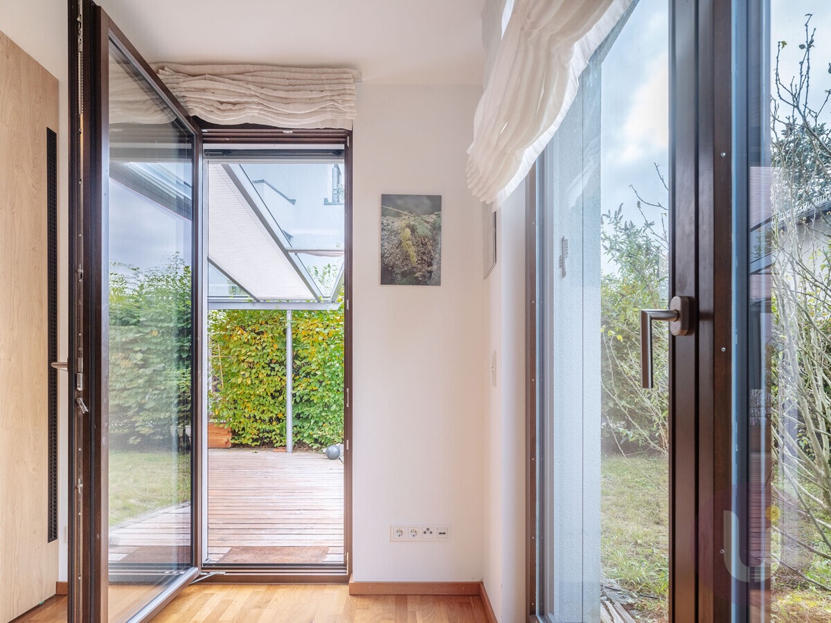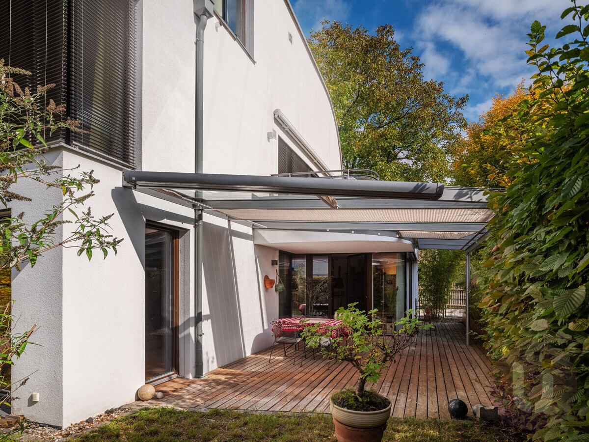 Die großzügige Terrasse mit elegantem Holzbelag wird zu Ihrer persönlichen Oase der Ruhe. Ein Glasdach mit elektrischer Verschattung bietet Schutz und Gemütlichkeit bei jedem Wetter.