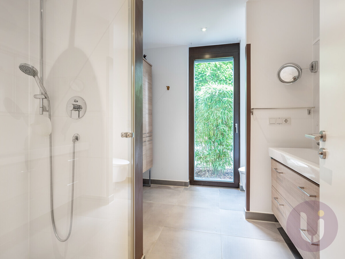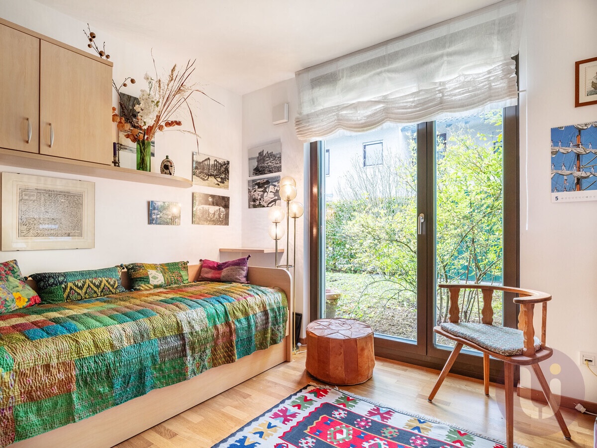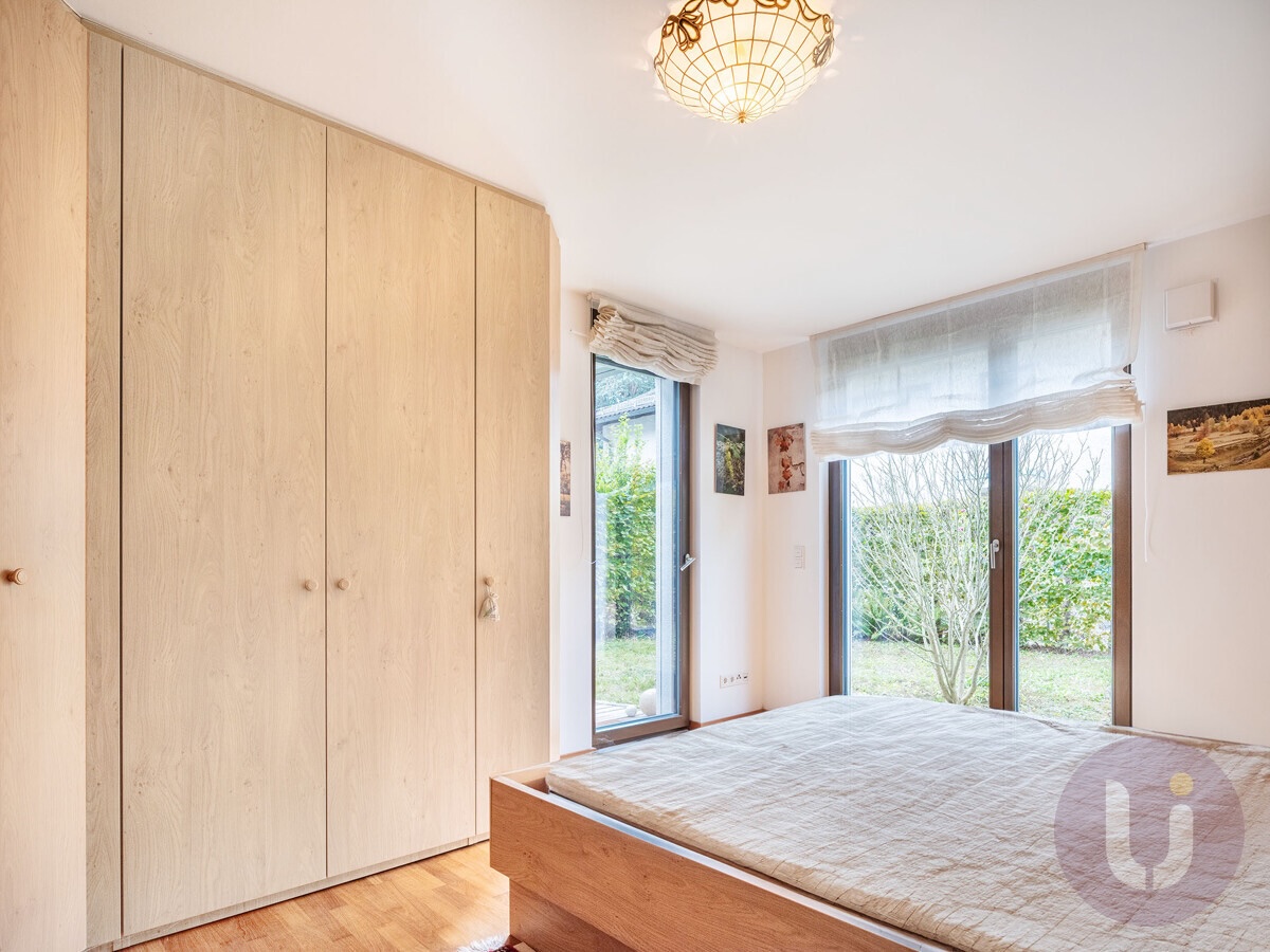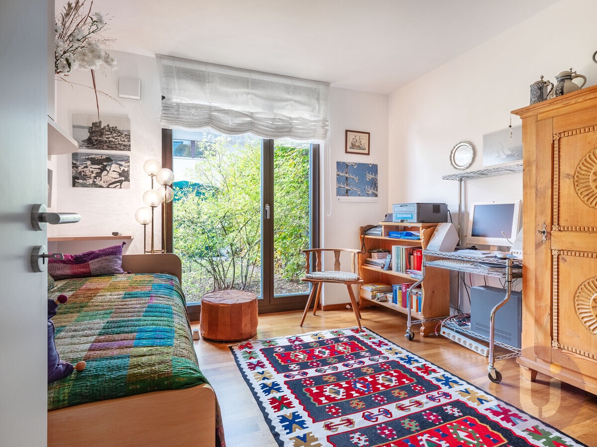 Beide Schlafzimmer verfügen ebenfalls über bodentiefe Fenster mit wunderbarem Blick in den Garten und schaffen so eine harmonische Verbindung zwischen Innen und Außen.